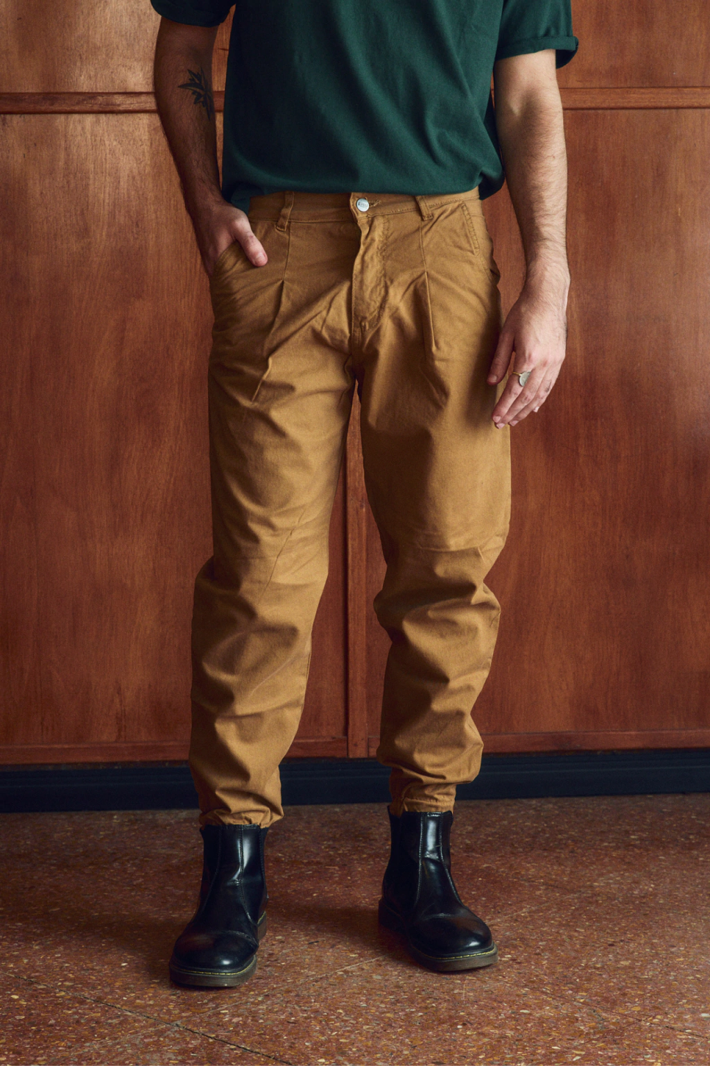 Babucha confeccionada en gabardina 100% algodón con proceso de teñido en color camel. Tiene pinzas en la parte delantera, así como bolsillos en ambos laterales y elásticos en sus botamangas. En la parte posterior posee bolsillos tipo ojal.