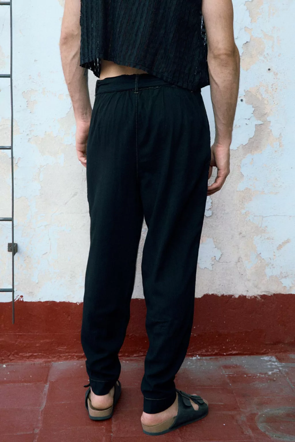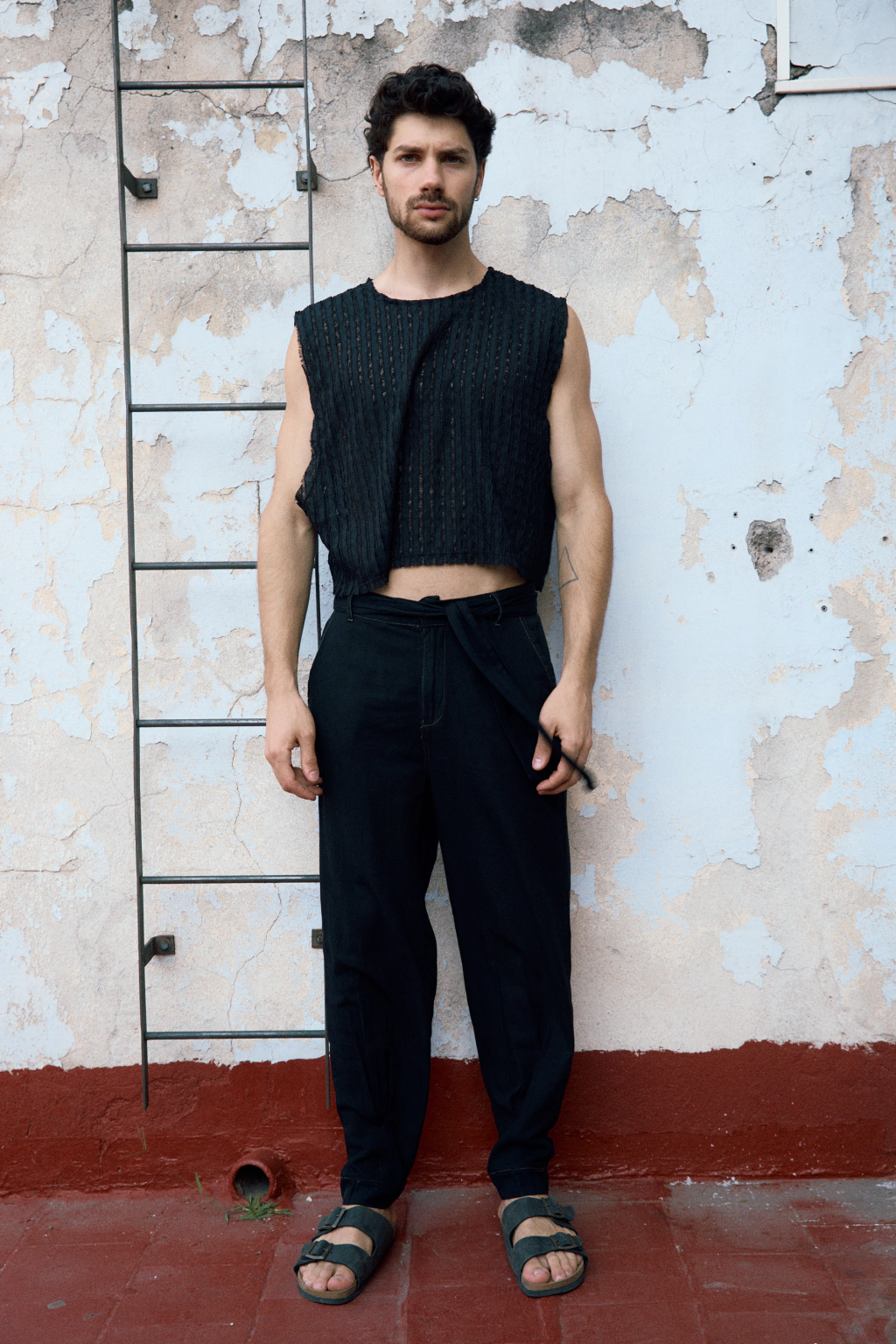 Pantalón tipo sastrero confeccionado en denim light 100% algodón súper liviano, cuya textura es similar al lino, con proceso de teñido en negro y costuras a contra-tono en color ocre.