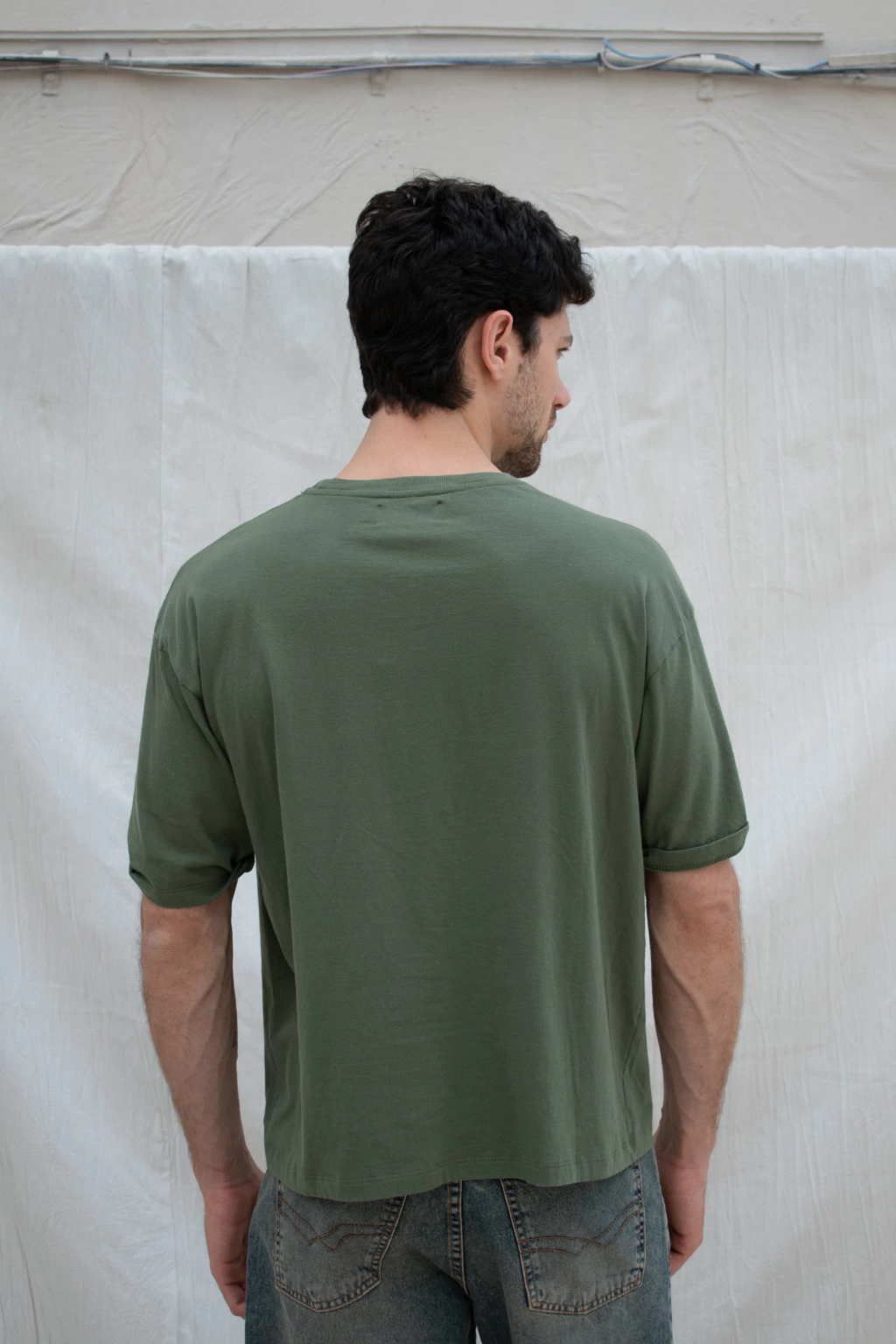 Remera regular fit confeccionada en jersey de algodón premium color verde oliva, al tacto posee una suavidad única y es ideal para cualquier época del año, siendo un complemento ideal para armar tus looks. En la parte delantera, sobre el lado superior izquierdo posee bordado el nombre de la marca con una longitud de 2,5cm. Posee cuello redondo cerrado con terminaciones en ribb a tono y un dobladillo con atraques en las mangas.